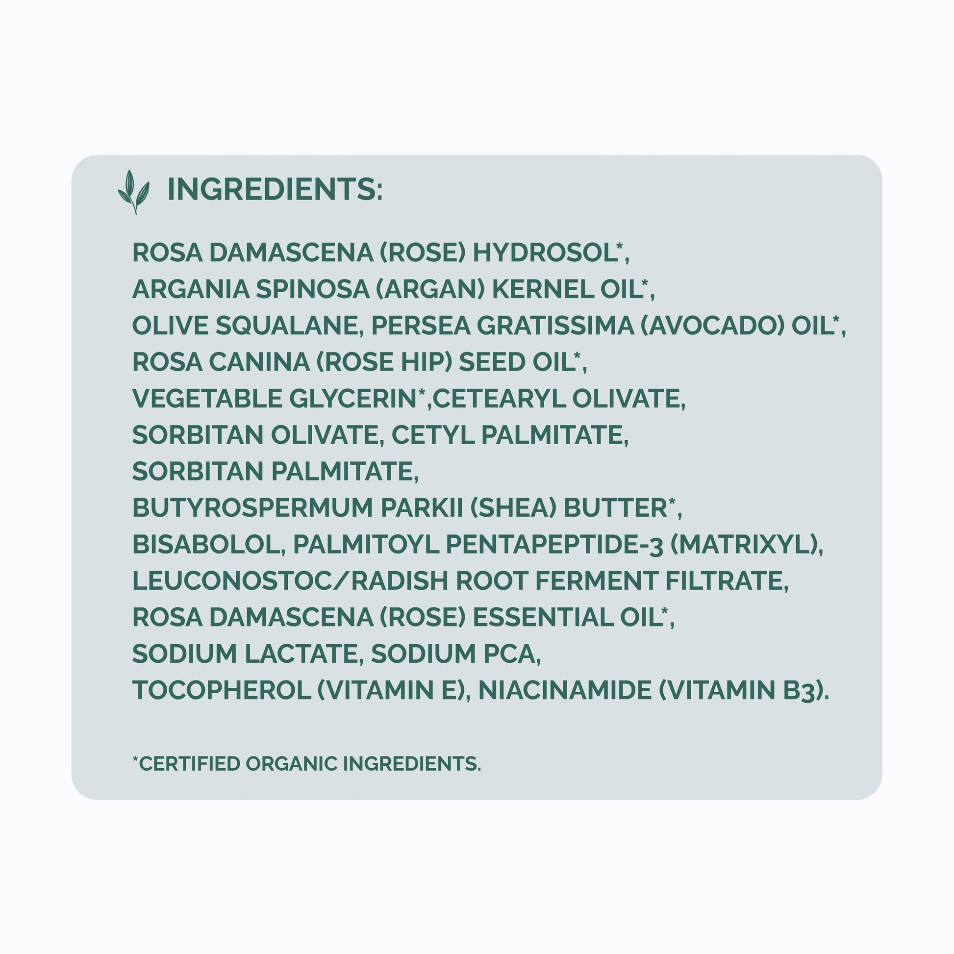 ROSA DAMASCENA (ROSE) HYDROSOL*, ARGANIA SPINOSA (ARGAN) KERNEL OIL*, OLIVE SQUALANE, PERSEA GRATISSIMA (AVOCADO) OIL*, ROSA CANINA (ROSE HIP) SEED OIL*, VEGETABLE GLYCERIN*, CETEARYL OLIVATE, SORBITAN OLIVATE, CETYL PALMITATE, SORBITAN PALMITATE, BUTYROSPERMUM PARKII (SHEA) BUTTER*, BISABOLOL, PALMITOYL PENTAPEPTIDE-3 (MATRIXYL), LEUCONOSTOC/RADISH ROOT FERMENT FILTRATE, ROSA DAMASCENA (ROSE) ESSENTIAL OIL*, SODIUM LACTATE, SODIUM PCA, TOCOPHEROL (VITAMIN E), NIACINAMIDE (VITAMIN B3).